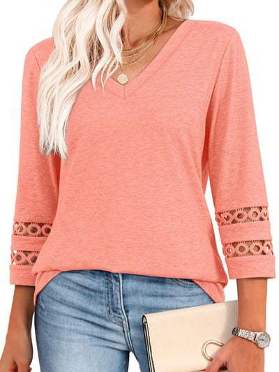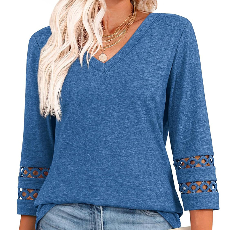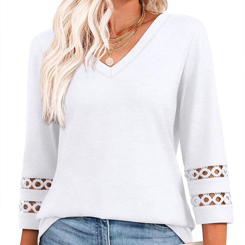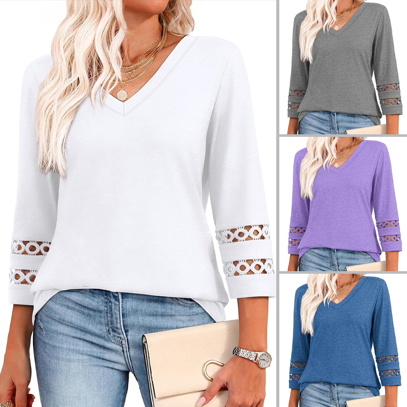 V-NECK DESIGN WITH ELEGANT DETAILING: Featuring a classic V-neckline and 3/4 length sleeves, this top frames the collarbone beautifully, adding a touch of femininity. The delicately hollowed cuffs and curved hemline bring a refined finish.
